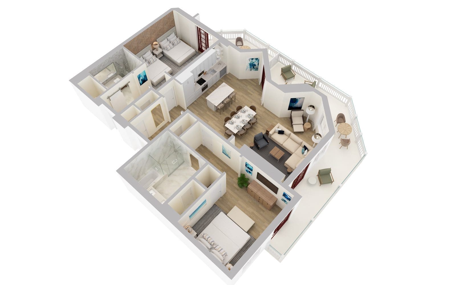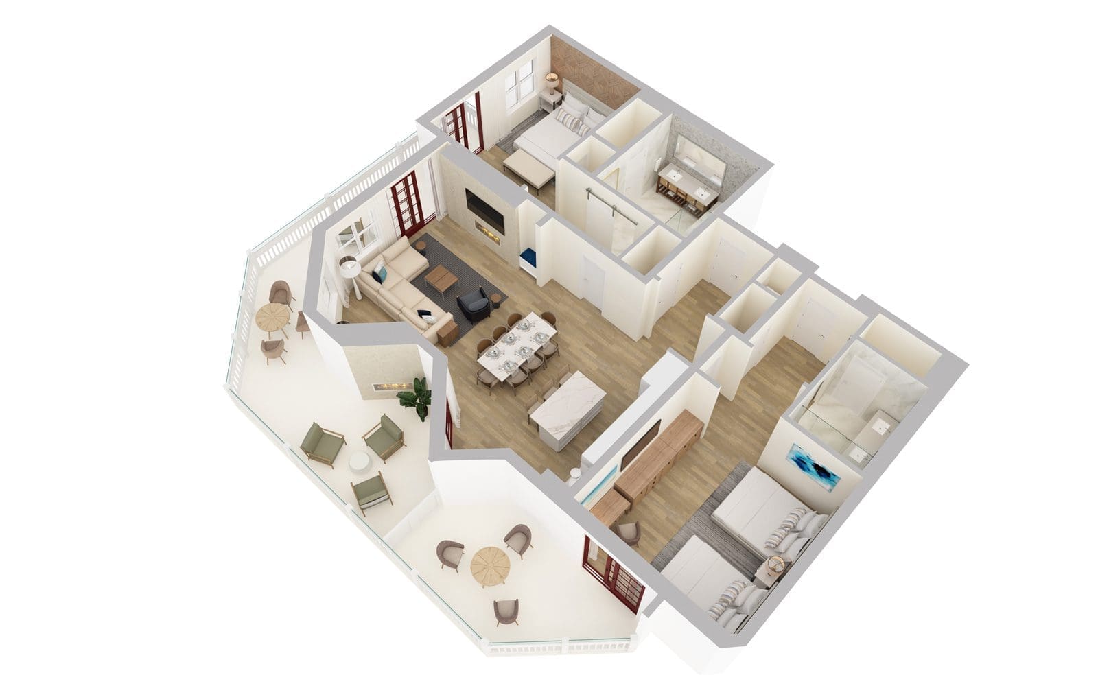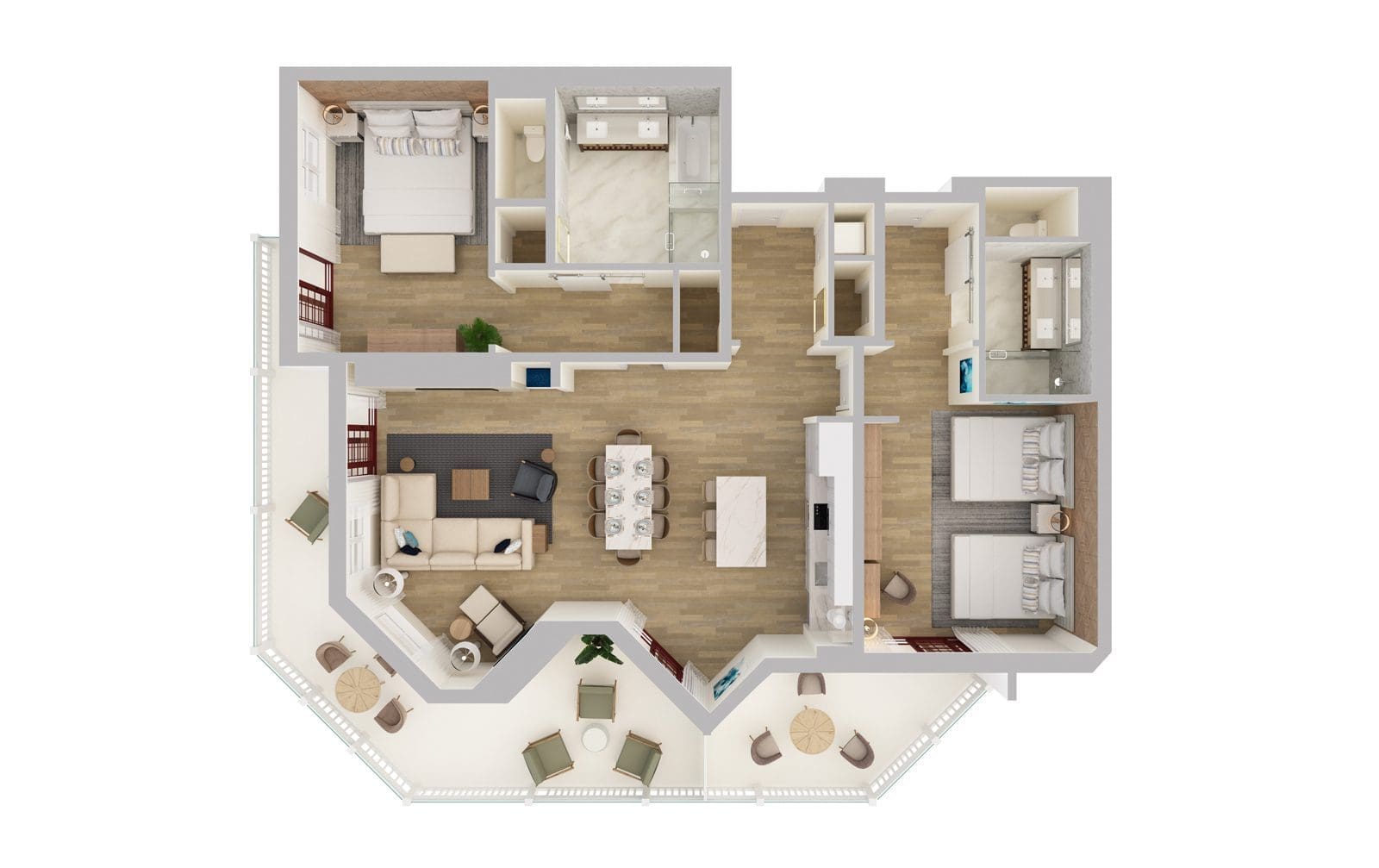 In the first bedroom, you'll discover a plush king bed and a seamless stone bathroom with a walk-in shower and dual sink vanity. The second bedroom offers two queen beds, a private veranda and a bathroom with a walk-in shower and dual sink vanity.