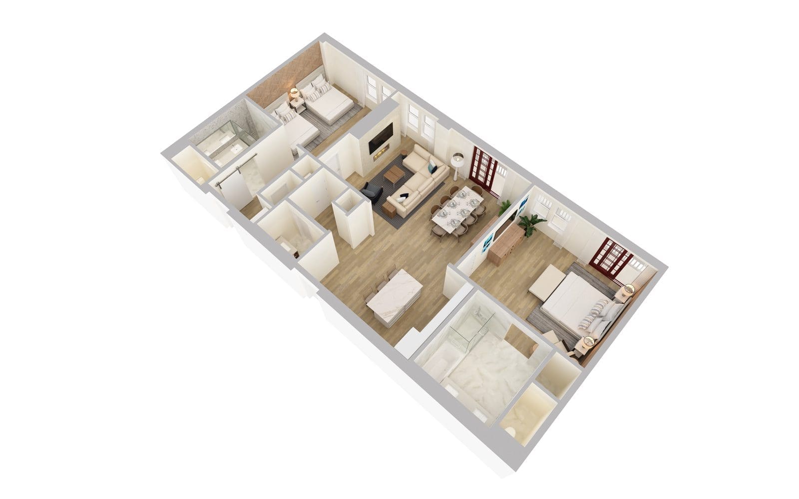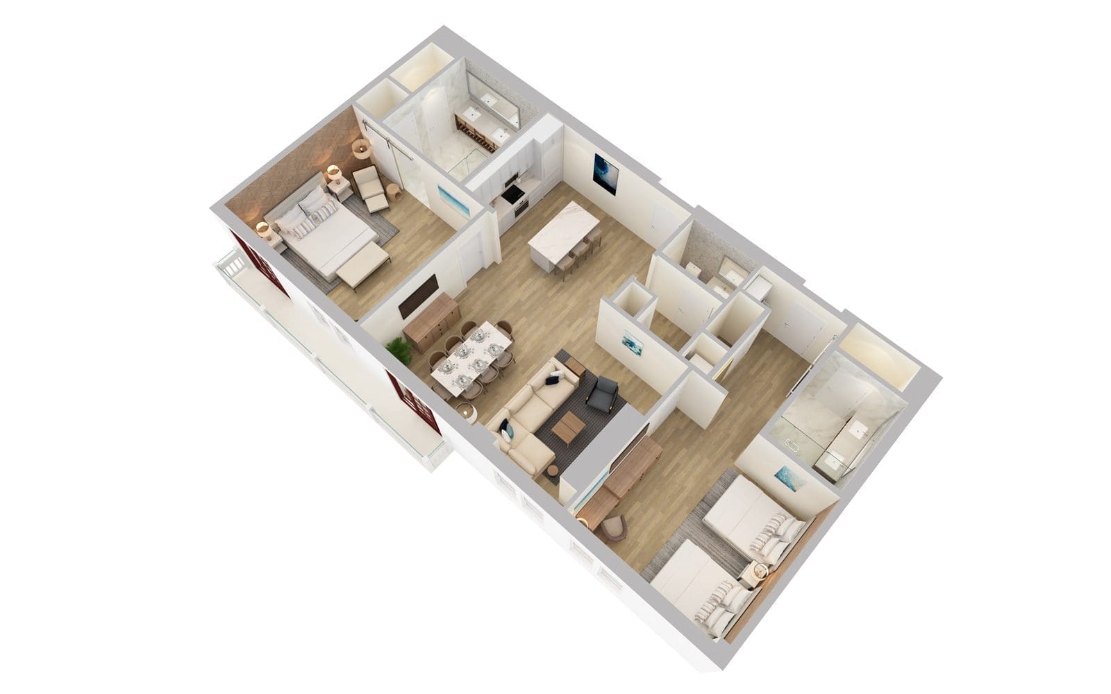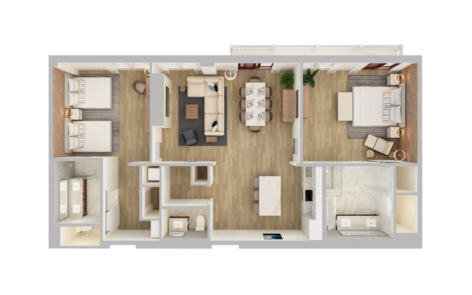 In the first bedroom, you'll discover a plush king bed and a seamless stone bathroom with a walk-in shower and dual sink vanity. The second bedroom offers two queen beds and a private bathroom with a walk-in shower and dual sink vanity.