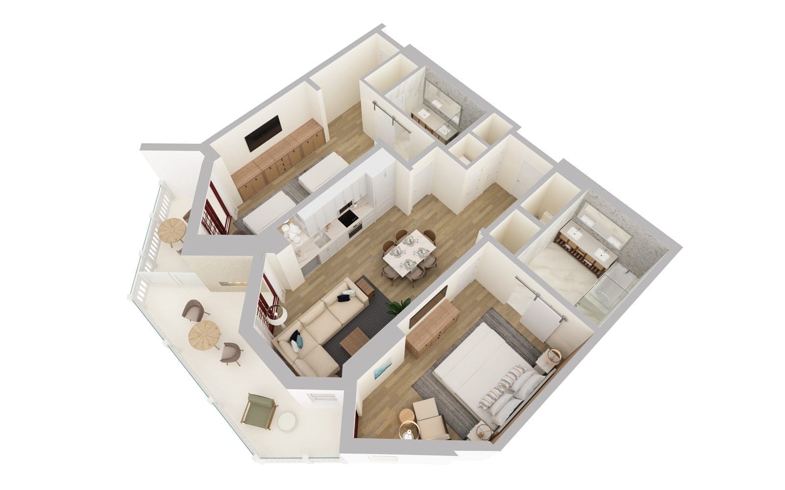 The primary bedroom offers a plush king bed and sophisticated accents, with an opulent bathroom featuring a walk-in shower, deep soaking tub, dual sink vanity, and seamless stone finishes. The second bedroom offers two queen beds and a private bathroom with a walk-in shower and dual sink vanity. Both bedrooms connect directly to the expansive veranda.