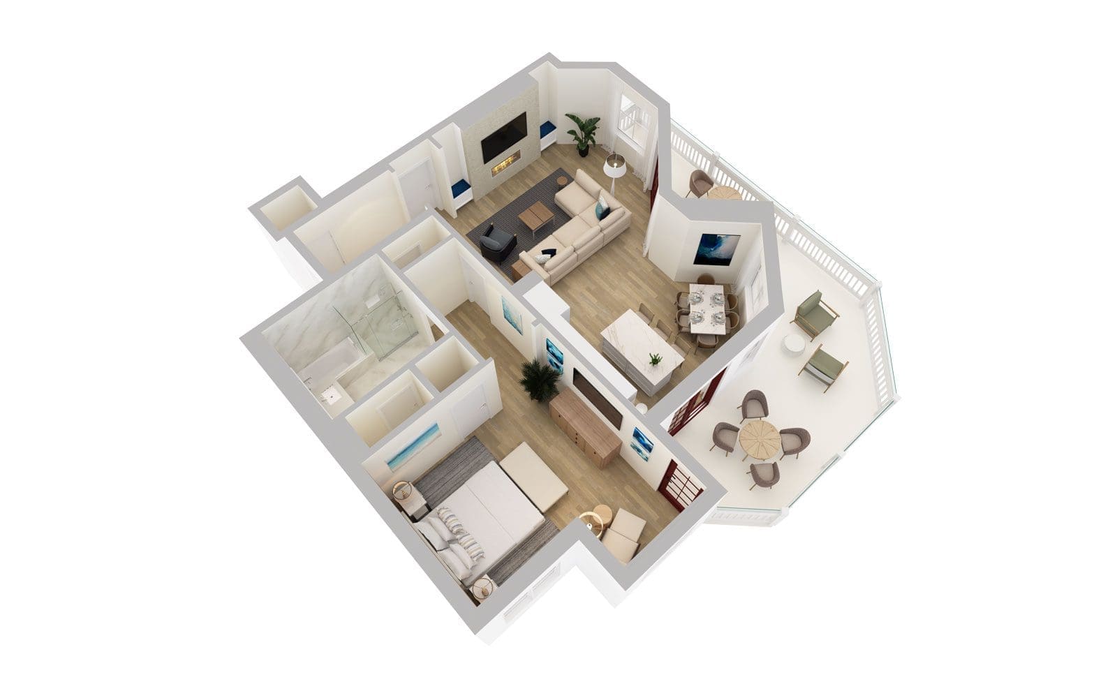 View of Glorietta Bay from your veranda, full kitchen with island and seating, living room with fireplace and sofa bed, washer/dryer, king bedroom with access to the veranda, and stone bathroom.