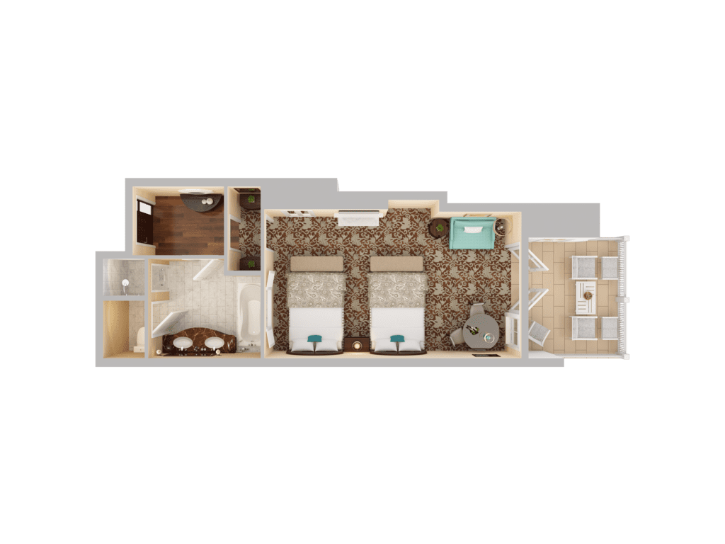 Inside, you'll find a bedroom with two queen beds, a cozy fireplace and seating area with a queen sofa bed. The luxurious marble bathroom offers a separate shower and deep soaking tub. Villas are located in the second row at Beach Village.