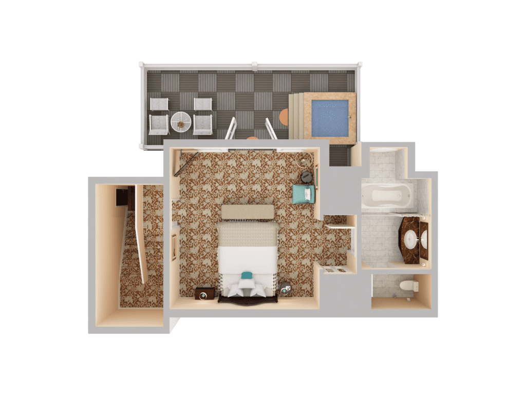Newly renovated ground-floor Junior Cottage with beachfront terrace with fire pit, separate bedroom with fireplace, seating area, and mobility-accessible marble bathroom with tub.
